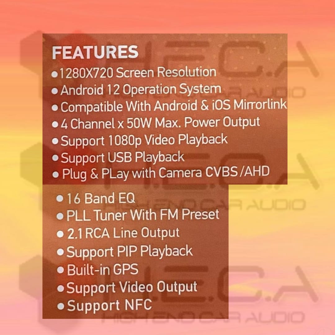 – 1280X720 Screen Resolution – Android 12 Operation System – Compatible with Android & iOS Mirrorlink – 4 Channel x 50W Max. Power output – Support 1080p Video Playback – Support USB Playback – Plug & Play With Camera CVBS/AHD – 16 Band EQ – PLL Tuner With FM Preset – 2.1 RCA Line Output – Support PIP Playback – Build in GPS – Support Video Out – Support NFC