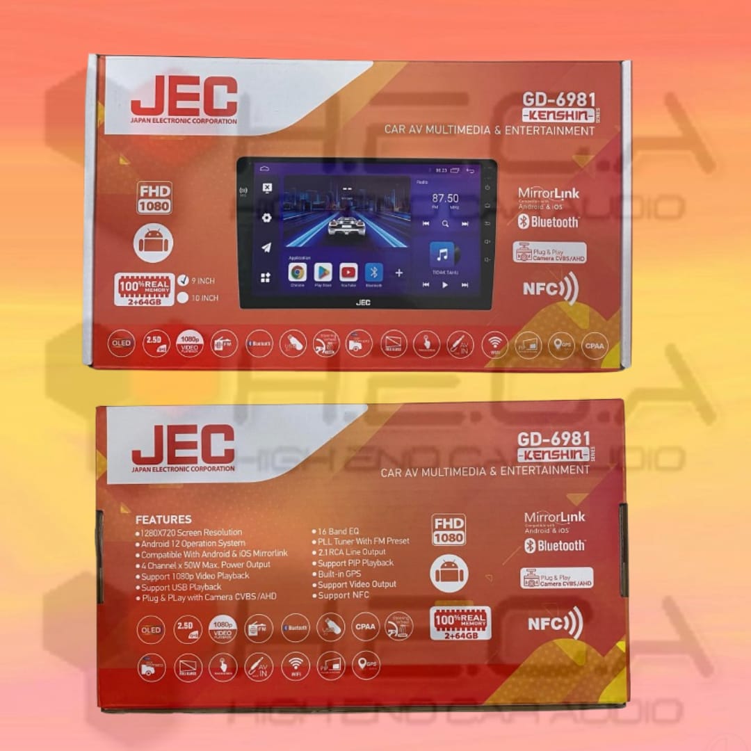 JEC KENSHIN Series NFC 2/64 GB Android 9″ Inch Head Unit GD-6981 Double Din Tape Mobil + Kamera Mundur